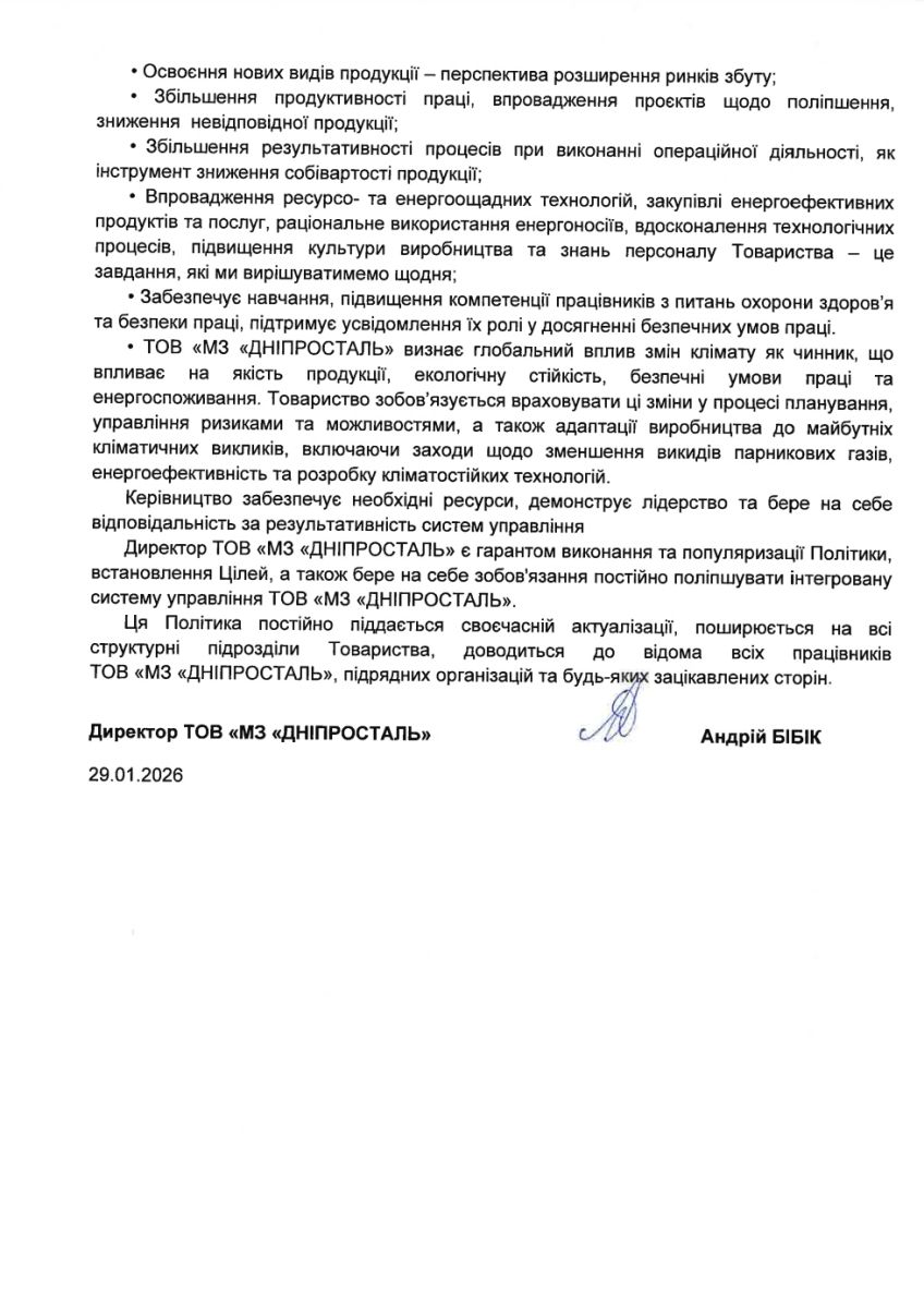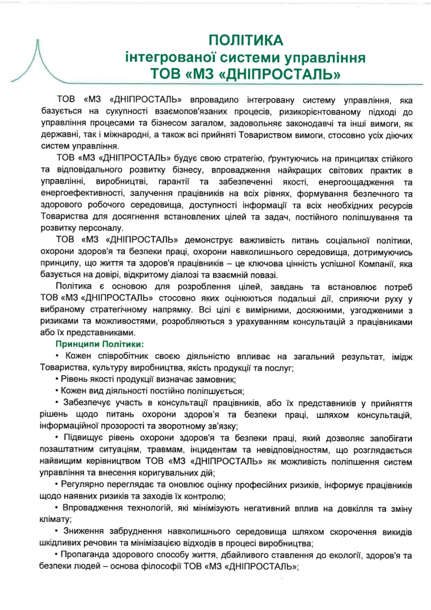 Політика інтегрованої системи управління ТОВ «МЗ «ДНІПРОСТАЛЬ»