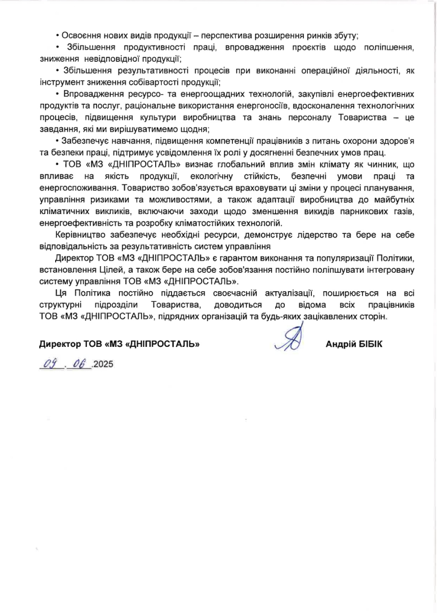 Політика інтегрованої системи управління ТОВ «МЗ «ДНІПРОСТАЛЬ»