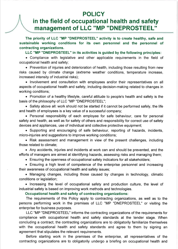 Policy in the field of occupational health and safety management of LLC "MP "DNEPROSTEEL"